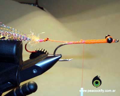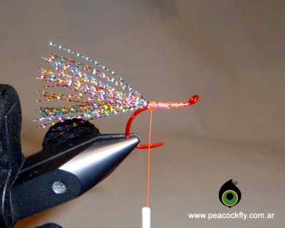 cola varias hebras de Krystal Flash en el anzuelo de pata