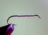 • 8°.  Formamos el bajo cuerpo de nuestra mosca con el cristal chenille oscuros.  Este lo enrollamos en torno al cuerpo de nuestro anzuelo avanzando hacia la cabeza del mismo, donde lo fijamos con nuestro hilo de montaje.